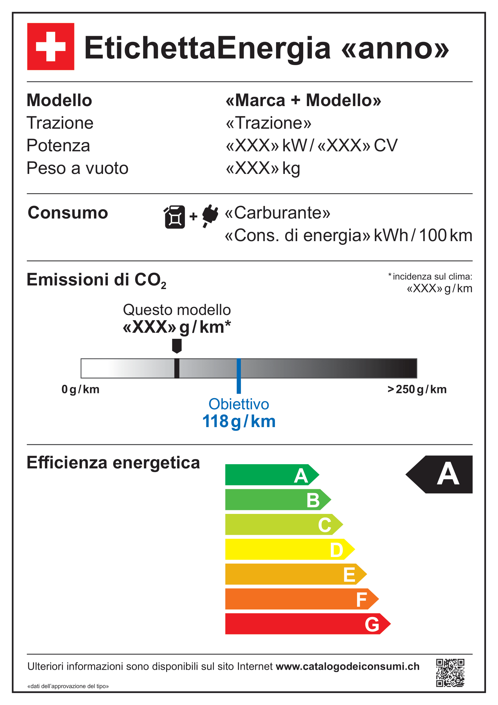 Le emissioni di CO2 sono rappresentate in modo conciso su una scala. Il valore target di 118 g/km di CO2 è indicato come valore di riferimento: corrisponde al valore target delle normative sulle emissioni di CO2 per le autovetture nuove. Per i veicoli che possono essere alimentati con combustibili fossili e ricaricati anche attraverso la rete elettrica (ibridi plug-in, range extender), viene indicato il totale del consumo elettrico e non. Per i veicoli che utilizzano carburanti con una componente biogenica, come il gas naturale, viene indicata anche la percentuale di emissioni di CO2 rilevanti per il clima, cioè quelle di origine fossile.