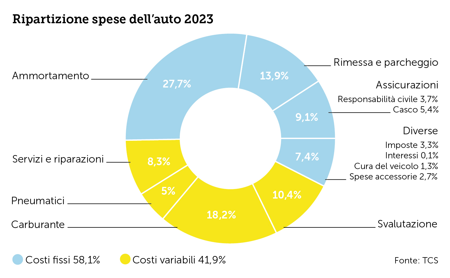 Mantenere un’automobile comporta delle spese, fisse e variabili. Il consumo di carburante rientra fra queste ultime, che dipendono largamente dai chilometri percorsi. Secondo i parametri di calcolo del TCS, con 15'000 km all'anno e prezzo della benzina a 2.04 franchi, i costi d’esercizio sono i seguenti: