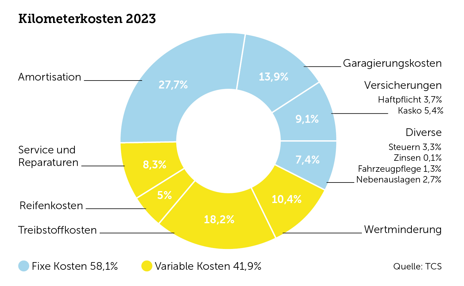 Mit den TCS-Berechnungsansätzen ergeben sich bei einer Jahresfahrleistung von 15‘000 km und einem Benzinpreis von 2.04 Franken folgende Betriebskosten: